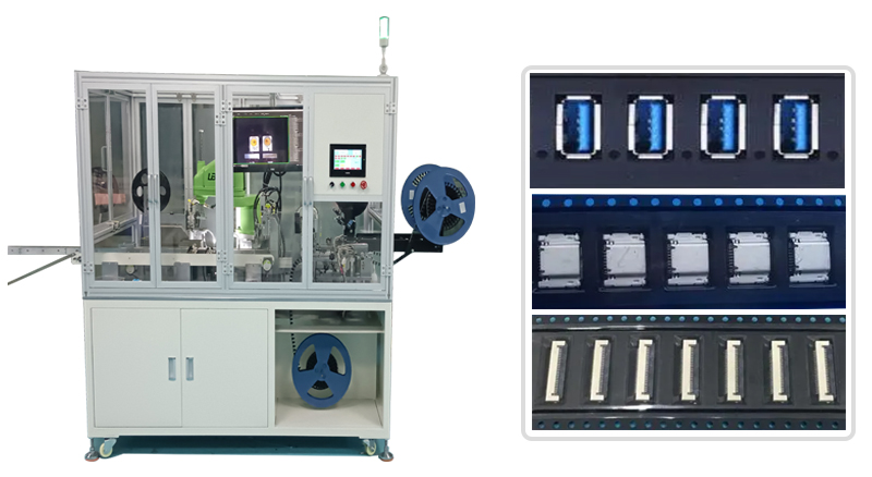 產(chǎn)品簡介: 連接器載帶載帶包裝機,是指以機器替代人工,針對連接器產(chǎn)品進行自動化機械包裝的機器設(shè)備;常用于:連接器載帶自動包裝、螺母載帶自動包裝,IC載帶自動包裝,屏蔽罩載帶自動包裝,彈片載帶自動包裝,輕觸開關(guān)載帶自動包裝,半導體載帶自動包裝,沖壓件載帶自動包裝,環(huán)形器載帶自動包裝,SMT載帶自動包裝,PET載帶自動包裝等。